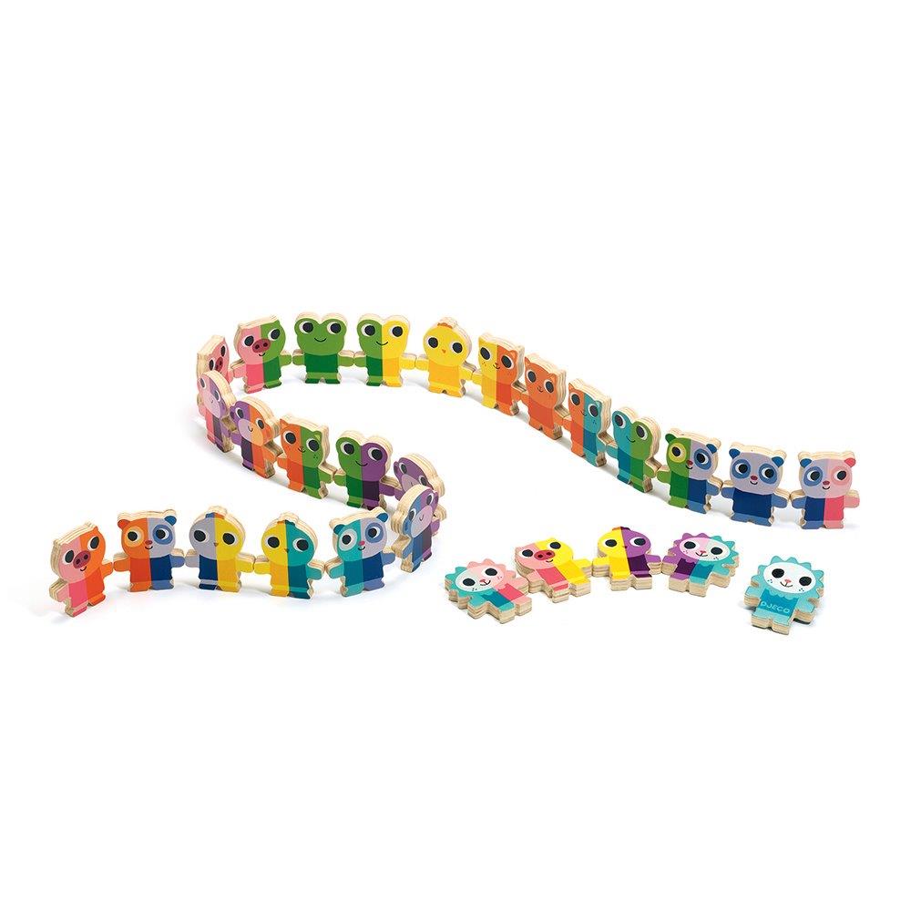 Διασκεδάστε με το ξύλινο ντόμινο της εταιρίας Djeco. Ένα κλασικό και διαχρονικό παιχνίδι, δοσμένο με την παιδική νότα της εταιρίας. Μέσα από το παιχνίδι το παιδί εξασκεί τη λεπτή κινητικότητα του, το συντονισμό χεριού ματιού και την αναγνώριση χρωμάτων. Το σετ περιλαμβάνει 28 ξύλινες φιγούρες από ζωάκια, οι οποίες είναι βαμμένες με οικολογικά λούστρα και χρώματα με βάση το νερό. Μπορείτε να παίξετε είτε στο επίπεδο είτε με τις φιγούρες όρθιες. Κατάλληλο για παιδιά ηλικίας 2 ετών και άνω. Σχεδιασμένο από τη Monster Riot.
