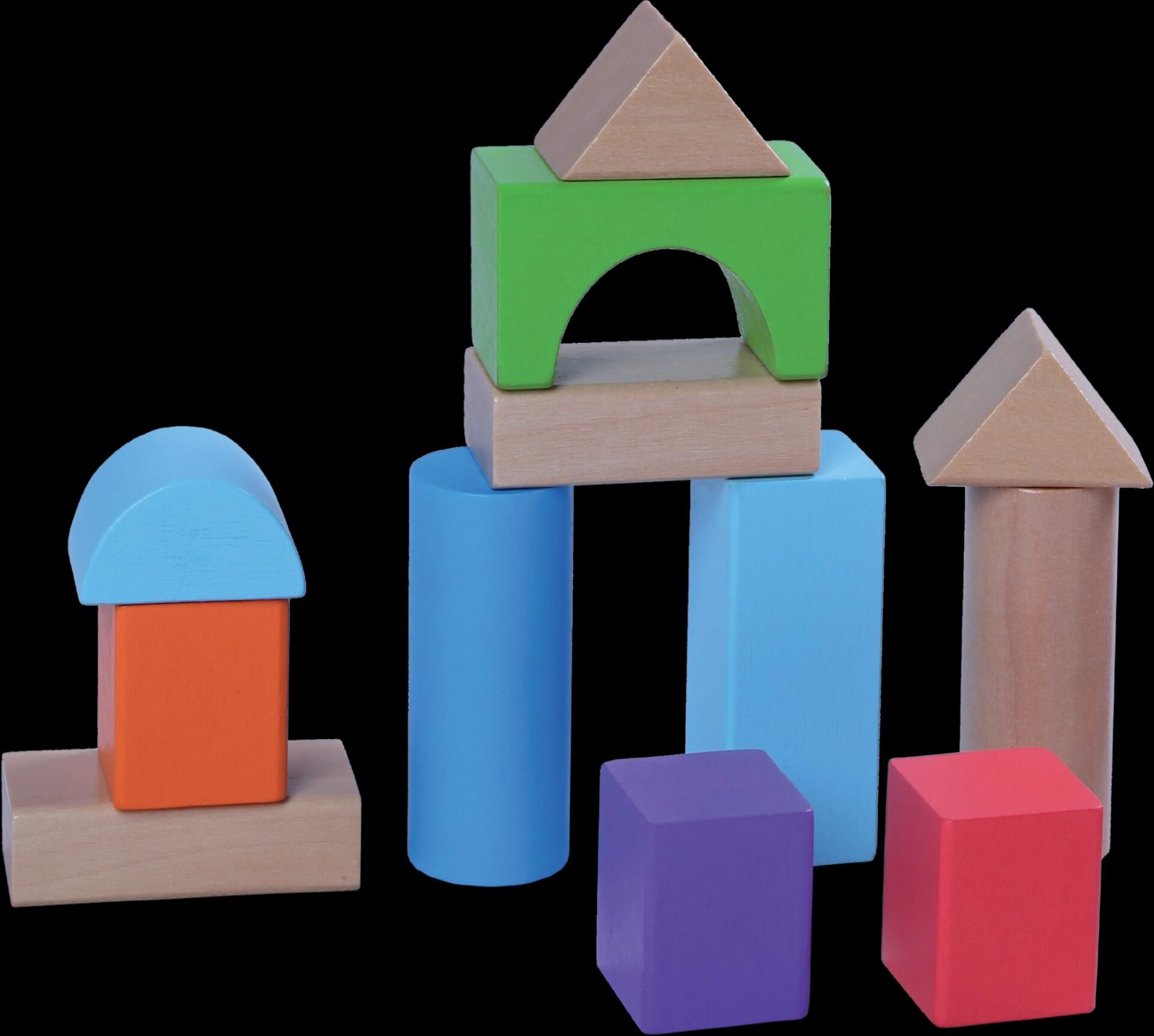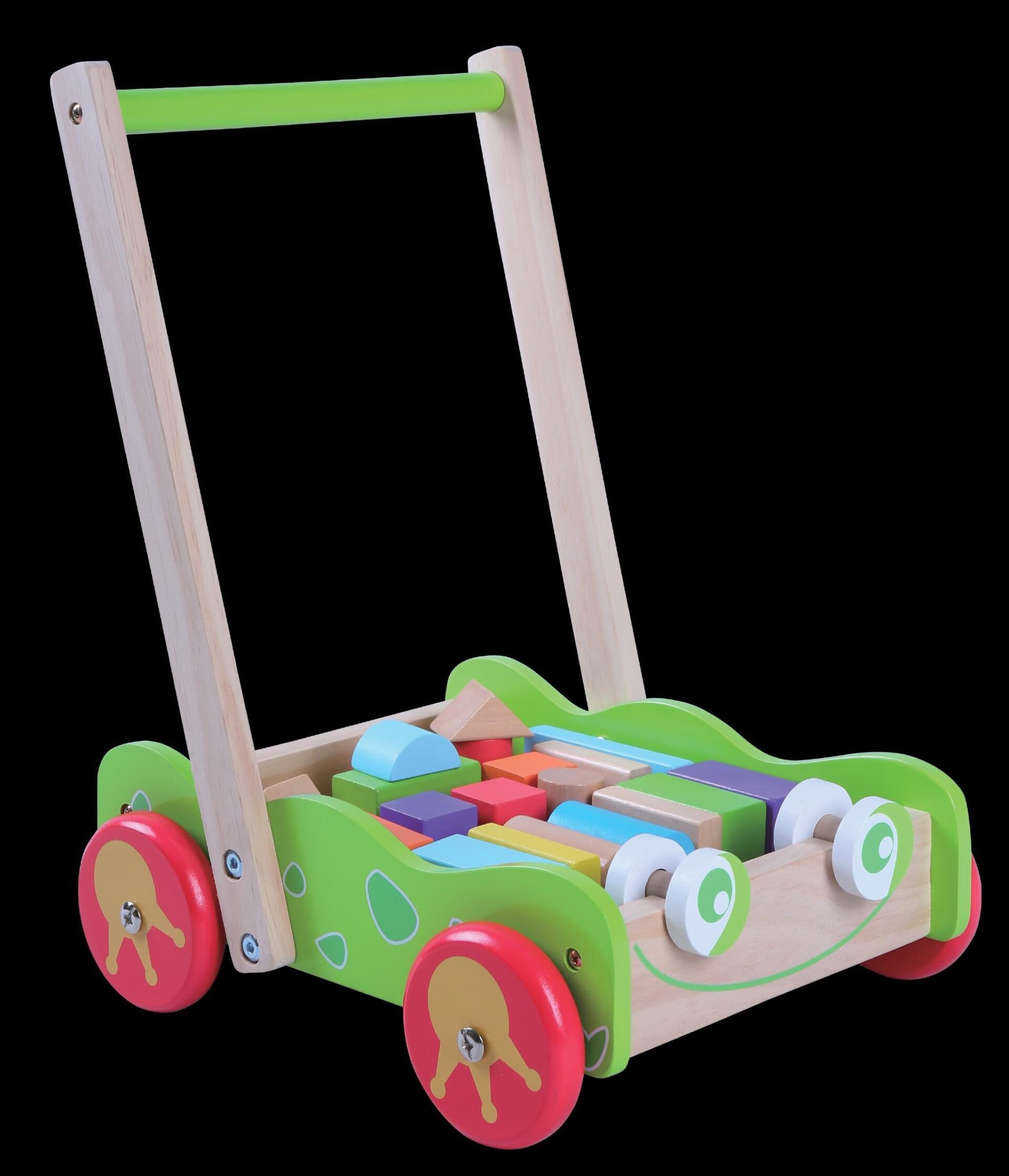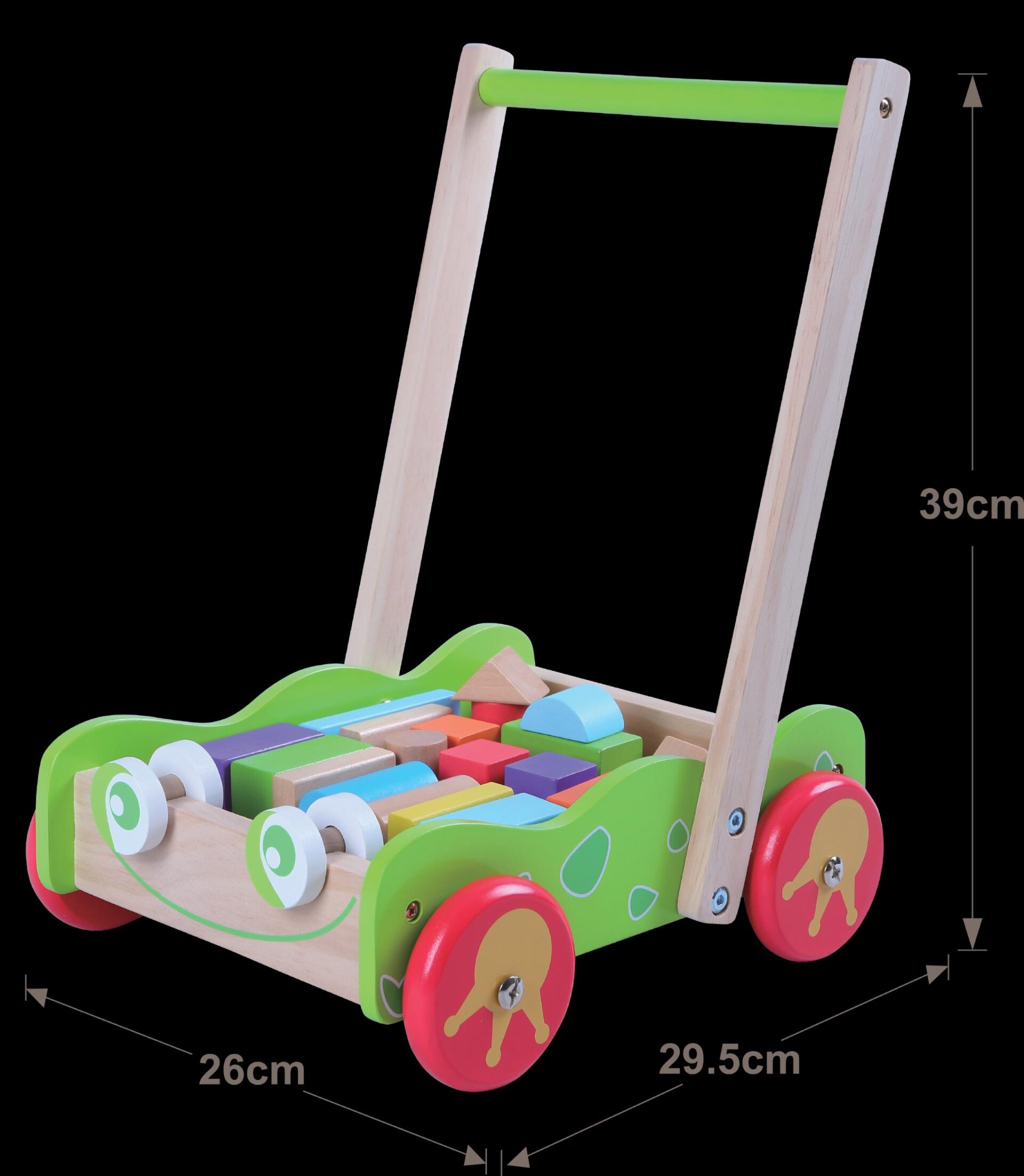 Ξύλινη περπατήστρα με 20 κύβους διαφορετικών σχημάτων, μεγεθών και χρωμάτων.