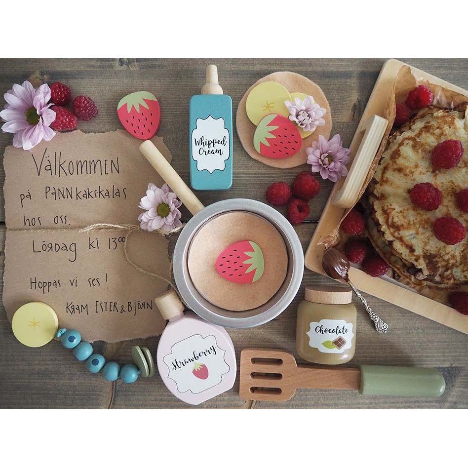 Το σετ περιέχει: τηγάνι, 2 τηγανίτες με Velcro, 3 φέτες μπανάνας με Velcro, 3 φέτες φράουλας με Velcro, 1 τσαμπί βατόμουρα, 1 μπουκάλι μαρμελάδα φράουλα, 1 μπουκάλι κρέμα σοκολάτα, 1 μπουκάλι σαντιγί.