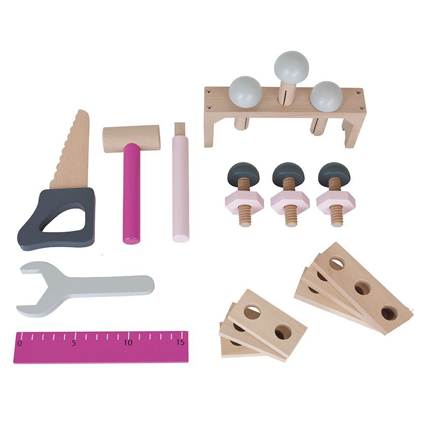 Το παιχνίδι περιέχει: 1 εργαλειοθήκη, 1 χάρακα, 1 κλειδί, 1 κατσαβίδι, 1 σφυρί, 3 καρφιά, 3 βίδες, 3 παξιμάδια και 3 μπλοκ.