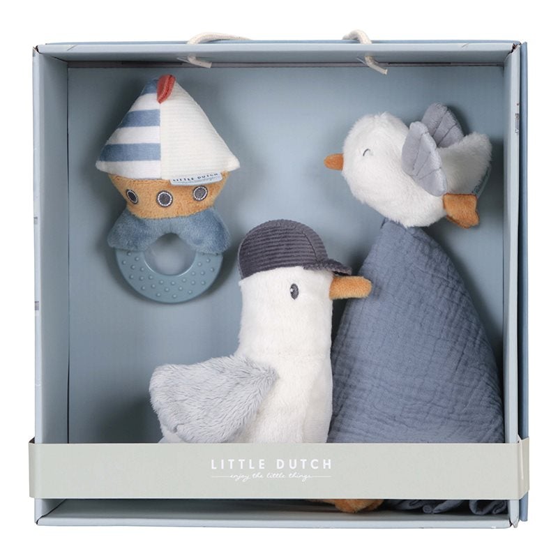 Αυτό το υπέροχο κουτί περιλαμβάνει τρία μαλακά αντικείμενα για να χαϊδεύετε, να αγκαλιάζετε και να παίζετε. Το πανί αγκαλιάς, τον γλάρο του Τζακ για ατελείωτες αγκαλιές και ένα δαχτυλίδι οδοντοφυΐας με ένα μαλακό ιστιοφόρο που κροταλίζει και προάγει τον συντονισμό χεριού-ματιού, διεγείροντας την περιέργεια του μωρού. Ο δακτύλιος θα προσφέρει επίσης καταπραϋντική δράση όταν αρχίσουν να εμφανίζονται τα πρώτα δόντια του μωρού.