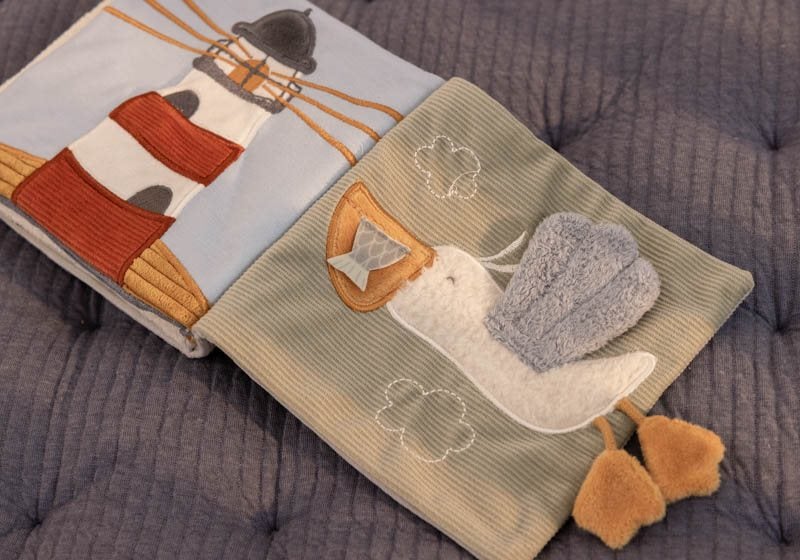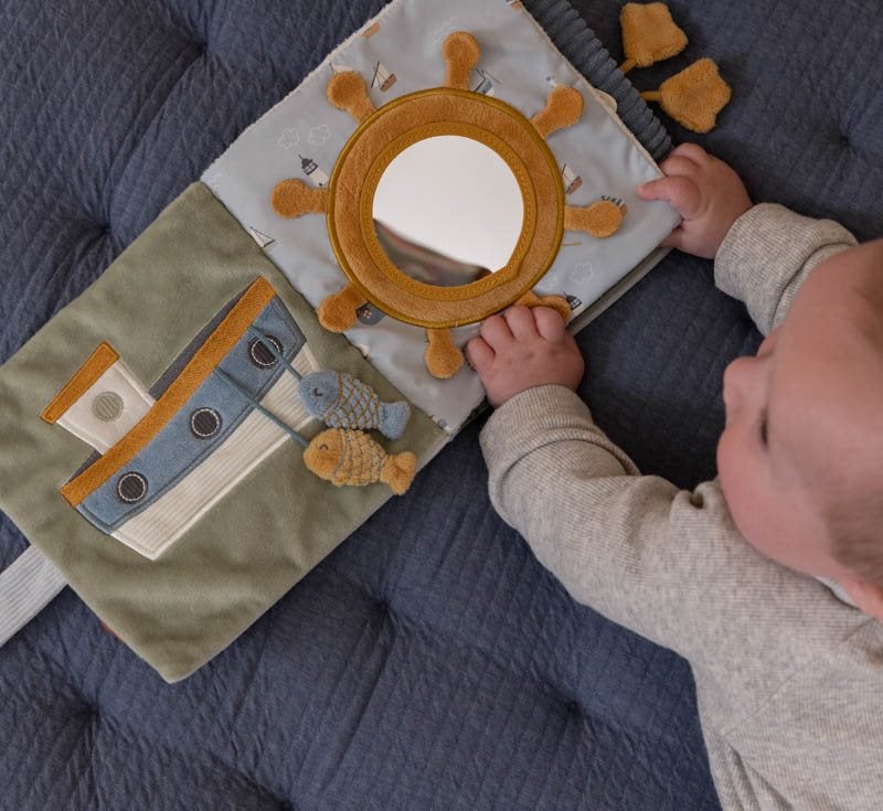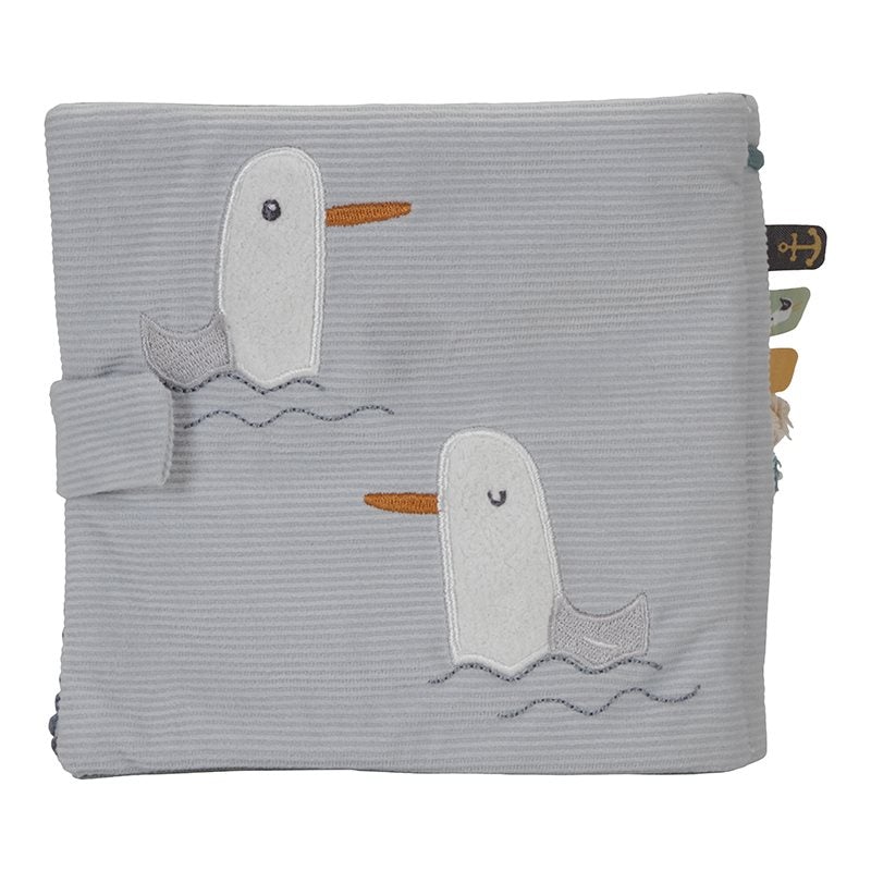 Βλέπεις τον γλάρο στο ιστιοφόρο; Βρες τον πελεκάνο που είναι έτοιμος να μαζέψει ψάρια από το νερό. Υπάρχουν πολλά διαφορετικά υλικά και δραστηριότητες για εξερεύνηση, όπως ένας καθρέφτης, τα τσιριχτά και τσαλακωμένα παιχνίδια. Το μαλακό φυλλάδιο έχει επίσης διαφορετικές ετικέτες που έχουν ωραία αίσθηση. Οι δραστηριότητες δεν διεγείρουν μόνο τις αισθήσεις, είναι επίσης καλές για την ανάπτυξη του συντονισμού χεριού-ματιού του μωρού.