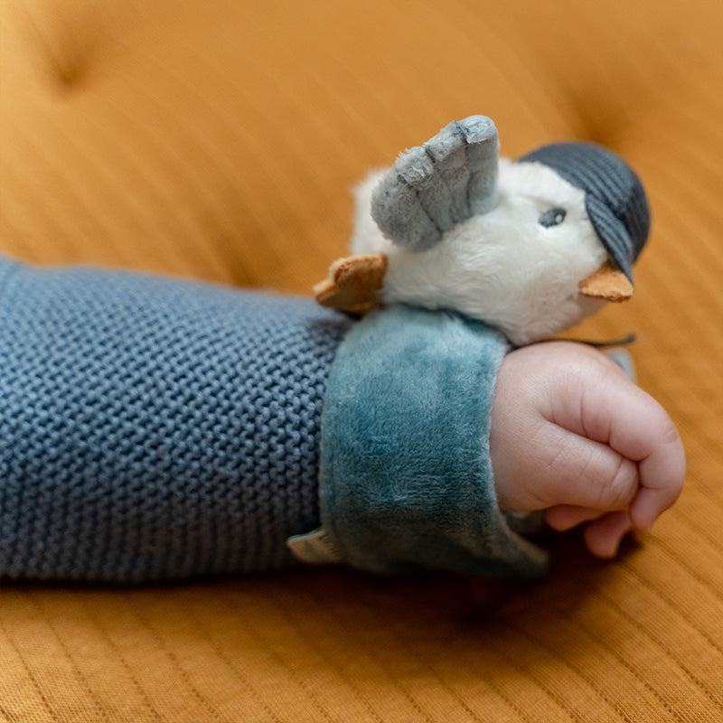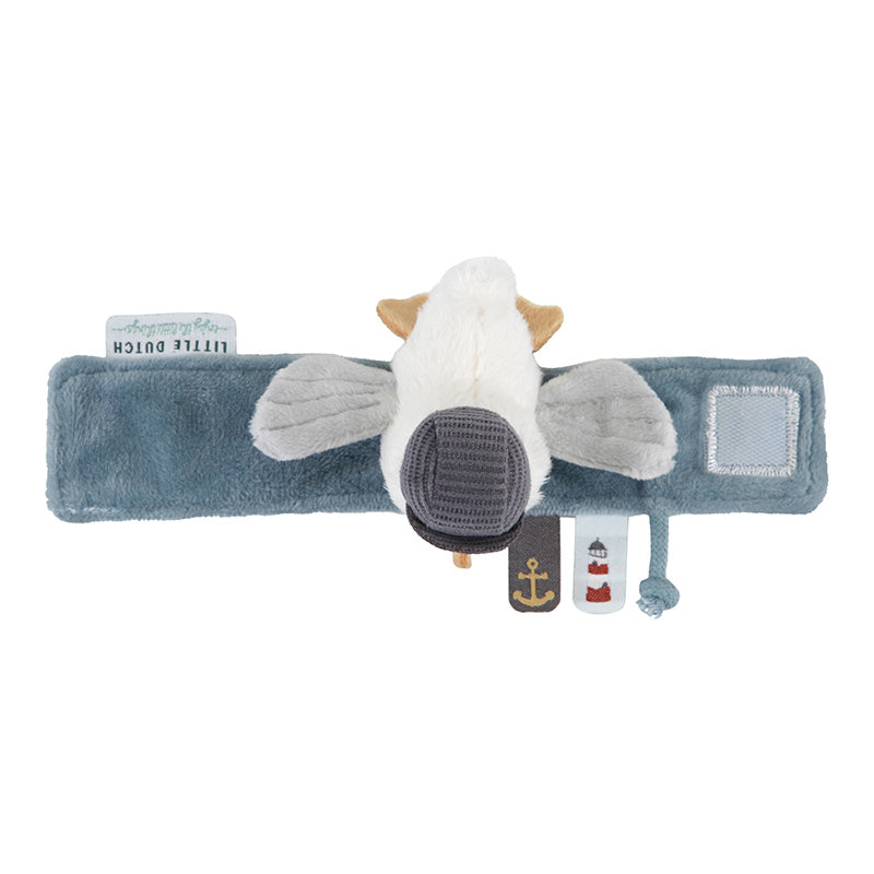 Χτυπήστε τα χέρια σας και διασκεδάστε! Αυτό το μαλακό βραχιόλι με κουδουνίστρα θα ενθουσιάσει το μωρό σας. Απλώς δέστε το γύρω από τον καρπό του μικρού σας και αφήστε τη διασκέδαση να αρχίσει. Ο χαδιάρης γλάρος πάνω από το βραχιόλι είναι έτοιμος να κινηθεί! Αλλά υπάρχουν περισσότερα για εξερεύνηση. Τα τσαλακωμένα μέρη, οι ετικέτες και ένας μικρός κόμπος ενθαρρύνουν το πιάσιμο και το άγγιγμα. Ένα υπέροχο παιχνίδι για ένα χαρούμενο μωρό.