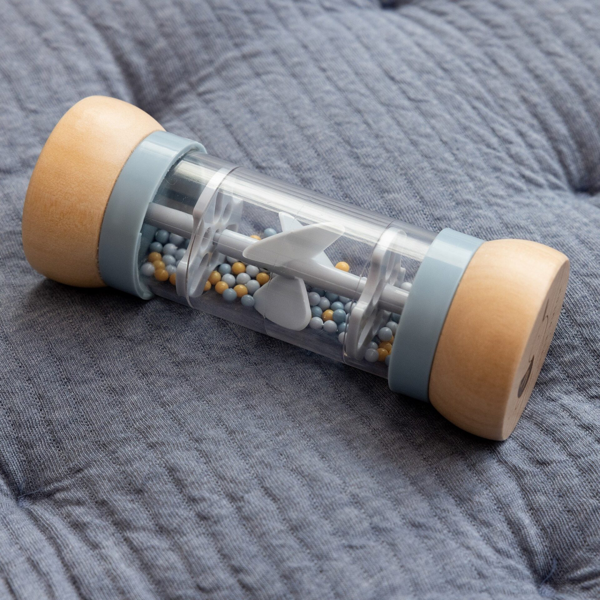 Αναποδογυρίστε την κουδουνίστρα και αφήστε το μωρό σας να απολαύσει τους χαλαρωτικούς ήχους της βροχής! Οι χάντρες, σε 3 διαφορετικά χρώματα, πέφτουν μέσα από μικρά ανοίγματα κάνοντας την προπέλα να περιστρέφεται με αποτέλεσμα την δημιουργία ενός ευχάριστου ήχου. Η κουδουνίστρα βροχής είναι σχεδιασμένη για τα μικρά χεράκια, για εύκολο κράτημα, ενώ παράλληλα διεγείρει τις αισθήσεις του μωρού. Η ξύλινη κορυφή και το κάτω μέρος είναι εικονογραφημένα με ένα γλάρο και μια βάρκα από τη συλλογή Sailors Bay.